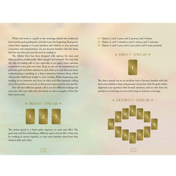 Bộ bài Mythos Tarot bao gồm 78 lá bài cạnh mạ vàng và sách hướng dẫn 176 trang.